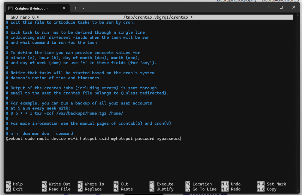 @reboot sudo nmcli device wifi hotspot ssid myhotspot password mypassword