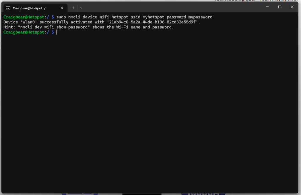 sudo nmcli device wifi hotspot ssid myhotspot password mypassword