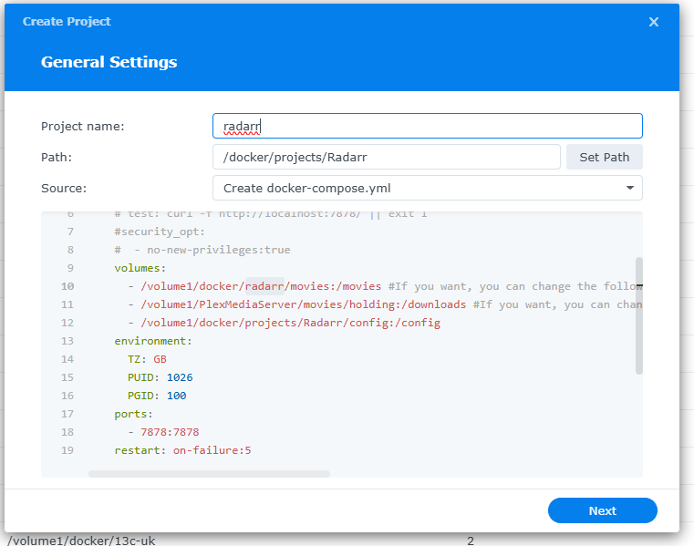 Give the project a name, change source to Create docker-compose.yml and add the path. Project name is all lower case.