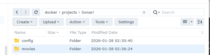 - /volume1/docker/projects/Sonarr/movies:/movies #If you want, you can change the following line /volume1/docker/radarr/movies with the path Location of your own Movie library.