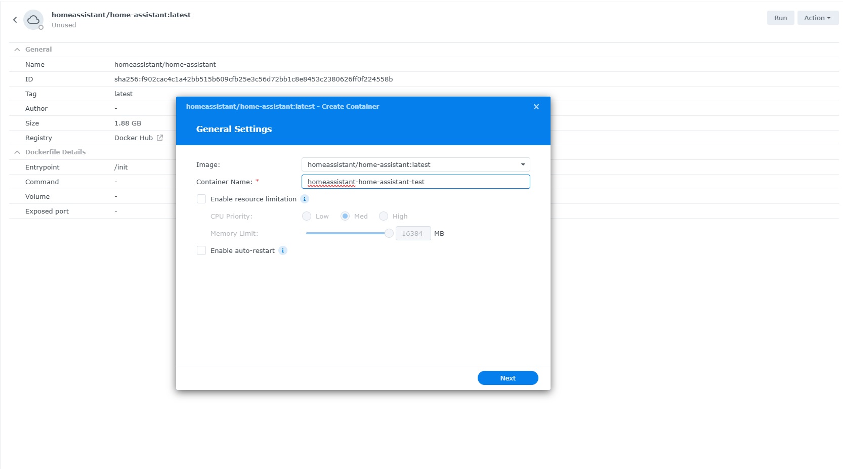 Now we need to check the Container we have just created is Running ok. Select Container from the left hand menu and you should see Homeassistant at the top with a Green Dot next to it. indicating it is Running.