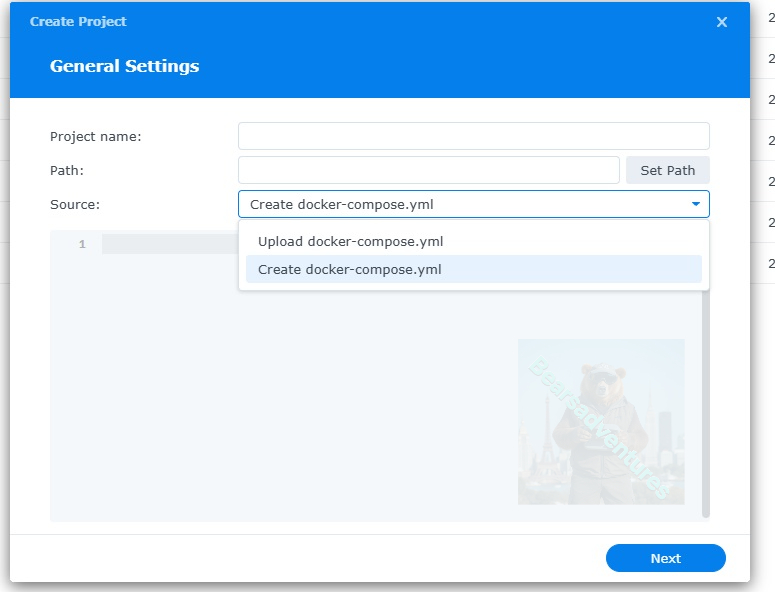 Give the project a name, change source to Create docker-compose.yml and add the path. Project name is all lower case.