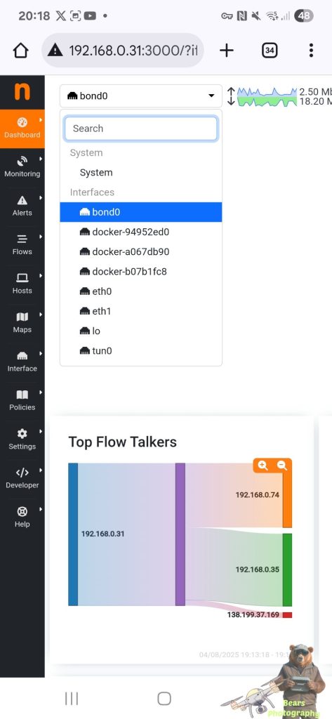 Now you in to the dashboard, you can navigate around a little, if you select the drop down box and select interface. Eth0 you will get all your traffic through your network interface. in my case for this project i have selected Bond0 as i have 2 networks connected together.