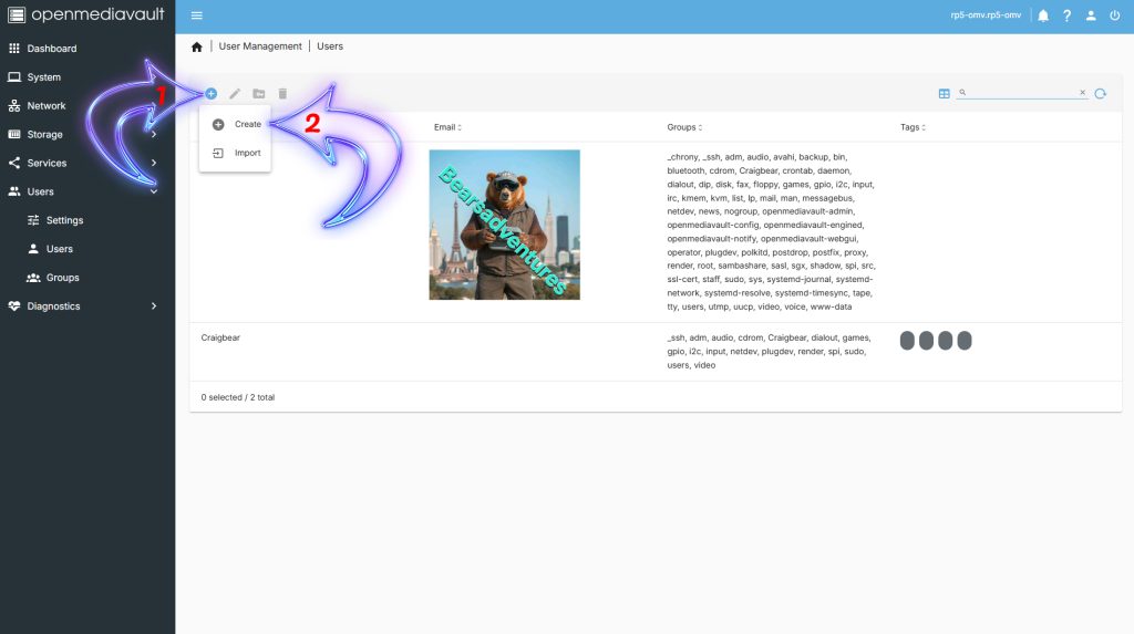 To begin creating a new user on our Raspberry Pi using OpenMediaVault click the plus symbol button (Arrow with 1 inside) and then click the “Create” option (Arrow with 2 inside).