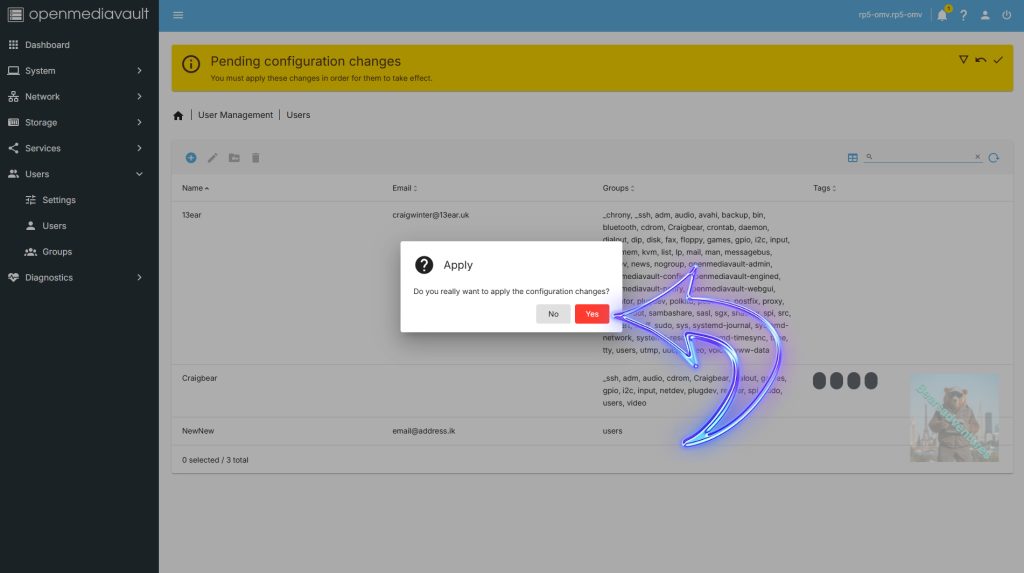 Now confirm the addition of this new user to your OpenMediaVault installation by clicking the “Yes” button.