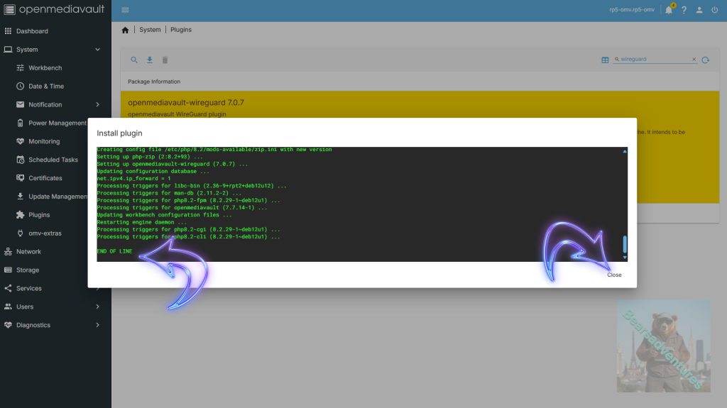 The install is complete and now close the install window. you will notice is says end of file. keep on the lookout for errors when install anything onto OMV for trouble shooting. We are all good with this install.