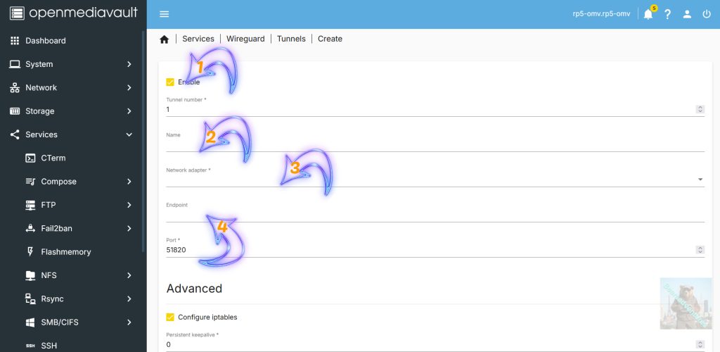Before you do anything Enable tunnel( Arrow with 1 inside ) . Next give the Tunnel a Name( Arrow with 2 inside ), Network adaptor( Arrow with 3 inside ) and the end point( Arrow with 4 inside ) needs tobe your DNS Mine is DUCK DNS. Leave port alone.