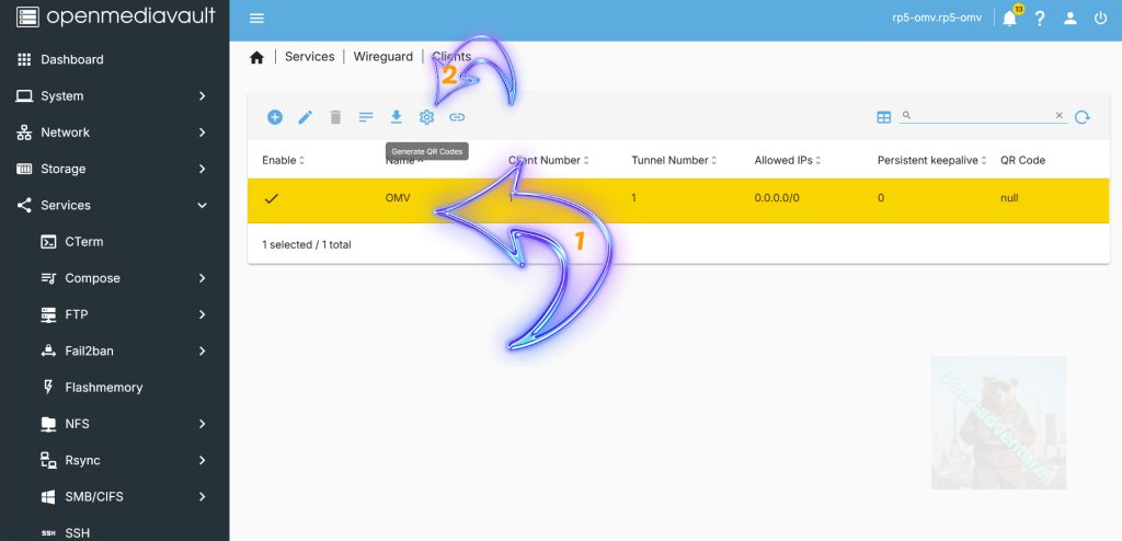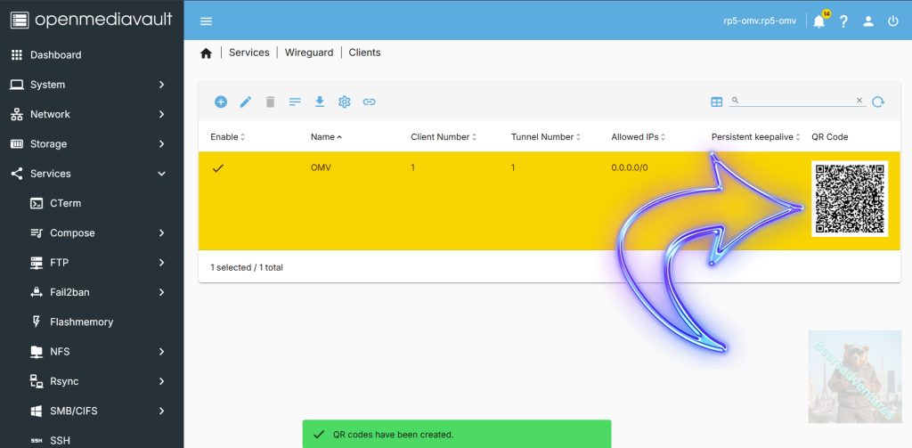 Select the client OMV( Arrow with 1 inside ) that we created and select qr code( Arrow with 2 inside )