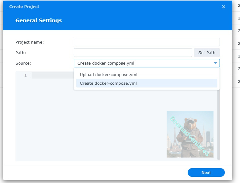 Give the project a name, change source to Create docker-compose.yml and add the path. Project name is all lower case.