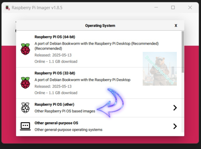 For server operations, I like to use Raspberry Pi Other for no desktop.