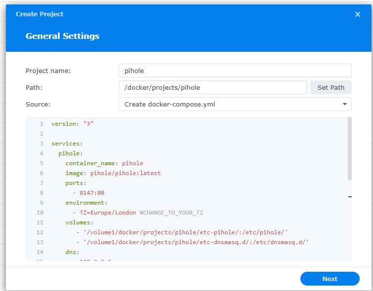 Give the project a name, change source to Create docker-compose.yml and add the path. Project name is all lower case.