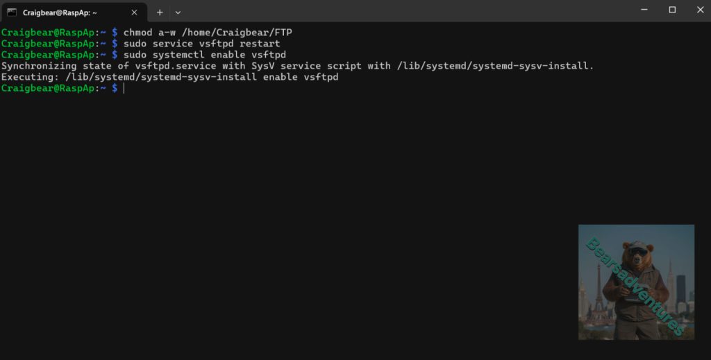 We should also ensure that the FTP server is set to start when our Raspberry Pi does by using the following command.