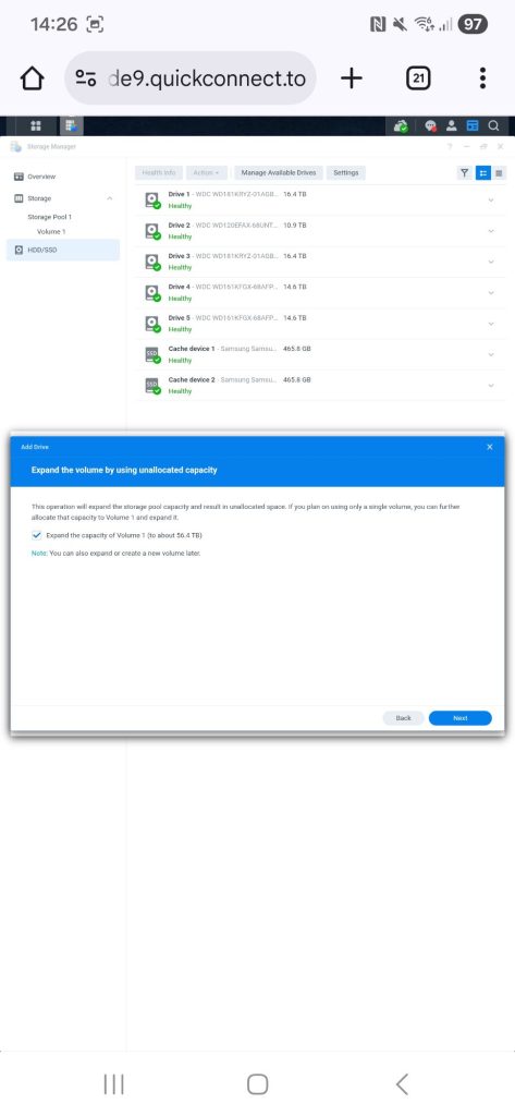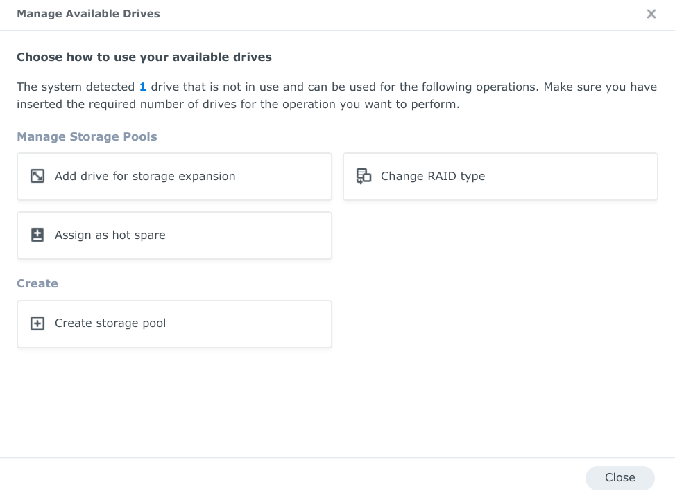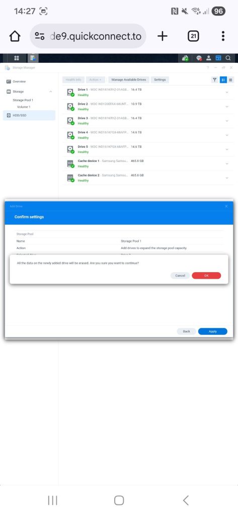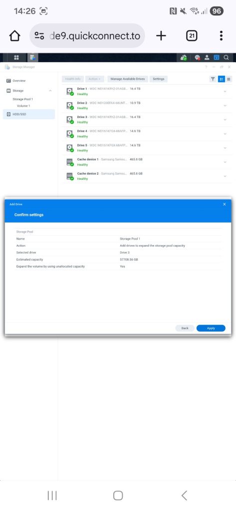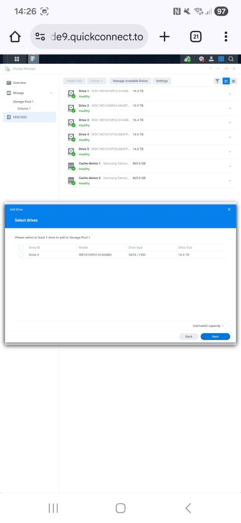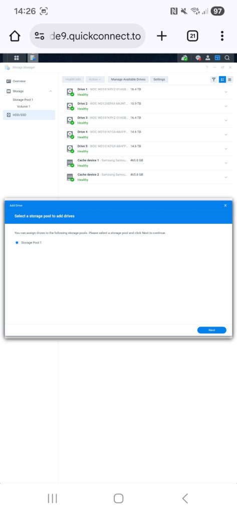 Now we have selected Add Drive for Storage Expansion you will be asked what pool you want to add the drive to. in my case Storage pool 1