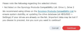 You will be prompted with a Notice of the drive is not part of the Synology product compatibility list. Just Select Continue.