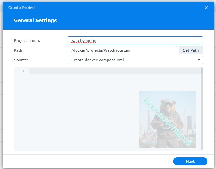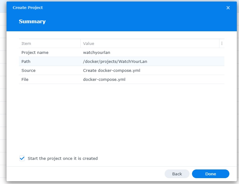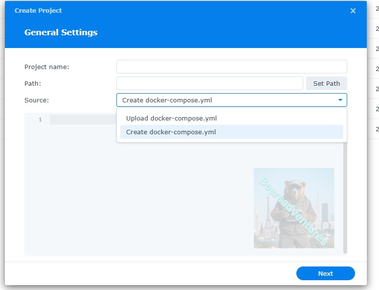 Give the project a name, change source to Create docker-compose.yml and add the path. Project name is all lower case.