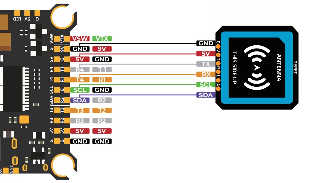 In the diagram below you will see TX4 and TX4 for this tutorial. It can get a little confusing. you need to match. GND, 5V, SDA and SDL on the FC board and GPS board. TX on the GPS needs to go on RX of the FC board. RX on the GPS needs to go on TX of the FC Board.