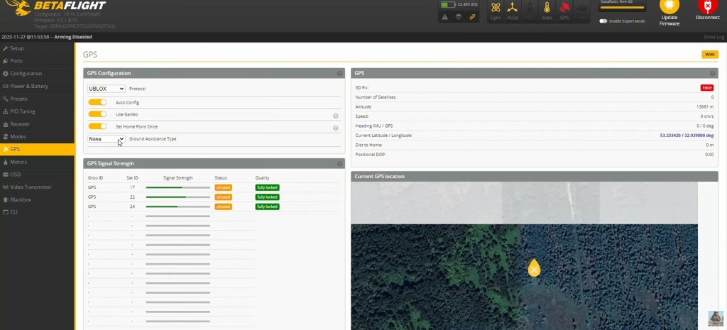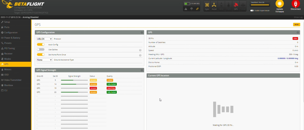 Looking at the GPS tab we can see Sats starting to get locked so we have success, GPS is now working with the D5.