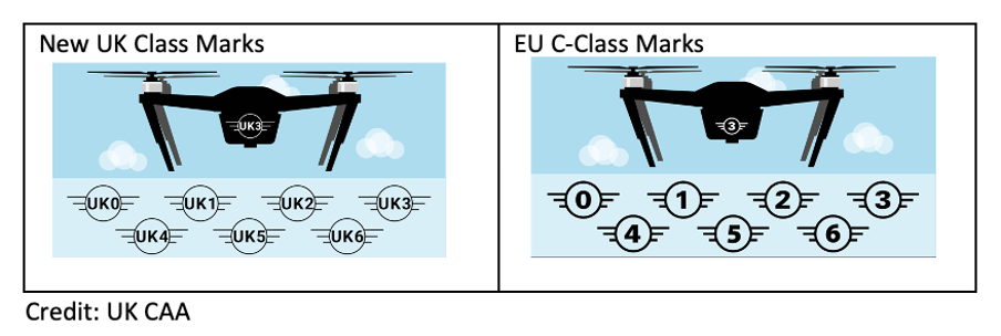 The CAA has defined several UK class marks, each linked to weight limits and operational categories: